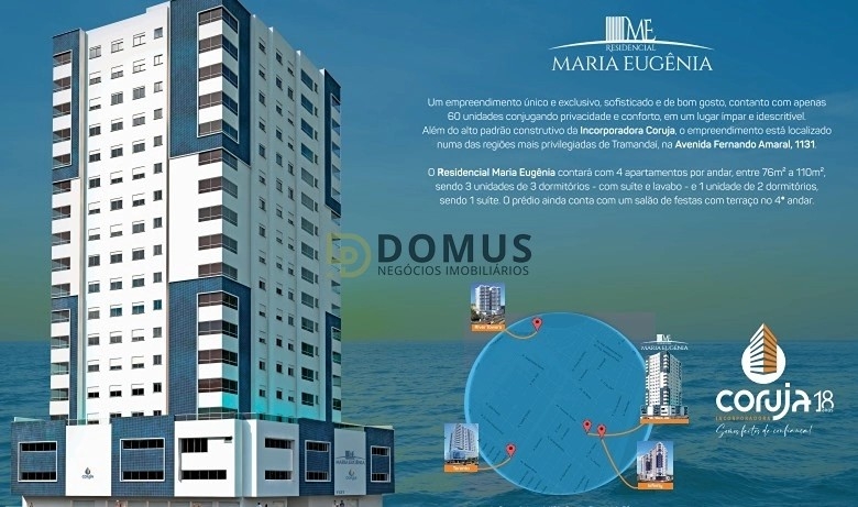 Residencial Maria Eugênia Viva a vida dos seus sonhos em Tramandaí!Com um projeto que une sofisticação, conforto e exclusividade, o Residencial Maria Eugênia é um empreendimento singular, pensado para quem valoriza o bem-estar e o alto padrão de moradia.Localizado em uma das regiões mais privilegiadas da cidade, na Avenida Fernando Amaral, 1131, o edifício conta com apenas 60 unidades, proporcionando privacidade e tranquilidade aos moradores.Desenvolvido pela renomada Incorporadora Coruja, o empreendimento reflete excelência em cada detalhe, desde o padrão construtivo até os acabamentos de primeira linha. São quatro apartamentos por andar, com metragens entre 76m e 110m, distribuídos em unidades de 2 e 3 dormitórios, todas com suíte e sacadas fechadas com churrasqueira.O Residencial Maria Eugênia ainda oferece uma infraestrutura completa, ideal para desfrutar momentos únicos com conforto e segurança:Diferenciais do empreendimento:Salão de festas com amplo terraço no 4 andar;Sacadas fechadas com churrasqueira;Espera para Split;Sistema de câmeras nas áreas comuns;Esquadrias externas em PVC;Medidores individuais de água e gás;Fachada revestida com detalhes em plaqueta;Excelente orientação solar;Piso em porcelanato;Hall de entrada decorado em porcelanato e granito;Dois elevadores;Grupo gerador no condomínio;Gás central e espera para água quente.Residencial Maria Eugênia onde conforto, elegância e localização se encontram.